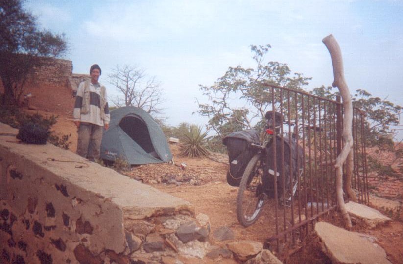 "In St Louis I took my bike to these guys for a service." "This is on Isle de Goree. This is an old slave house on the island, it is just off Dakar. An old bloke said I could camp on his land where he normally keeps his goats (you can't normally camp on Goree). Note the hat - often very cold at night."